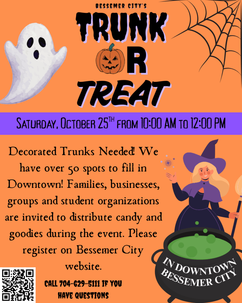 Bessemer City Parks and Recreation Department invites you to our Community-Wide Trunk or Treat on Saturday, October 25th 2025, from 10 am to 12 pm in Downtown Bessemer City. This family friendly event will offer trick-or-treating, games and fun! Free event and open to the public. Do not forget to wear your costume and bring your friends and family!